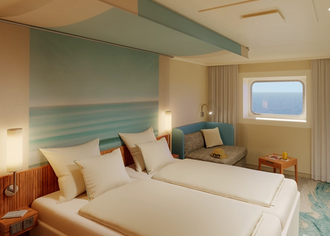 | CA - Vonkajšia kajuta PREMIUM / obmedzený výhľad 14-16,5 m². Neotvárateľné okno / obmedzený výhľad. 6. paluba. Max 2 osoby. Cenový model Premium. | 3 090 € 1 545 € za osobu |
